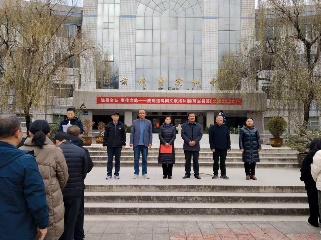 12月9日,“陇蜀金石 赓传文脉——陇蜀道碑刻文献拓片展(两当县篇)”开幕式在学校本部艺术实训中心楼前隆重举行。学校党委副书记、校长李艳红出席并致辞,特邀嘉宾、两当一中教师张辉做了发言。我院副院长胡文建、杨兴龙及教师代表与2025级部分学生参加。开幕式由我院院长潘江艳主持。