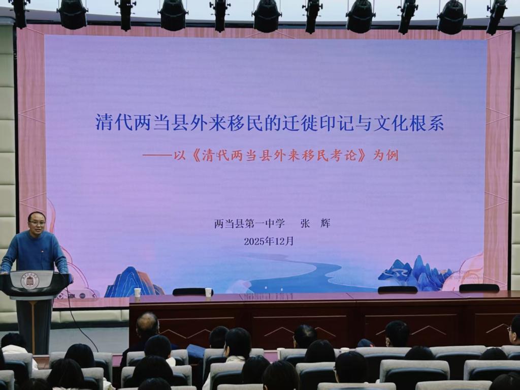 12月9日晚,我院在育心楼109报告厅成功举办“碑铭载乡愁”系列学术活动,特邀两当县第一中学教师张辉主讲“清代两当县外来移民的迁徙印记与文化根系——以《清代两当县外来移民考论》为例”专题报告。报告由温虎林主持,我院教师代表及2025级学生现场聆听。