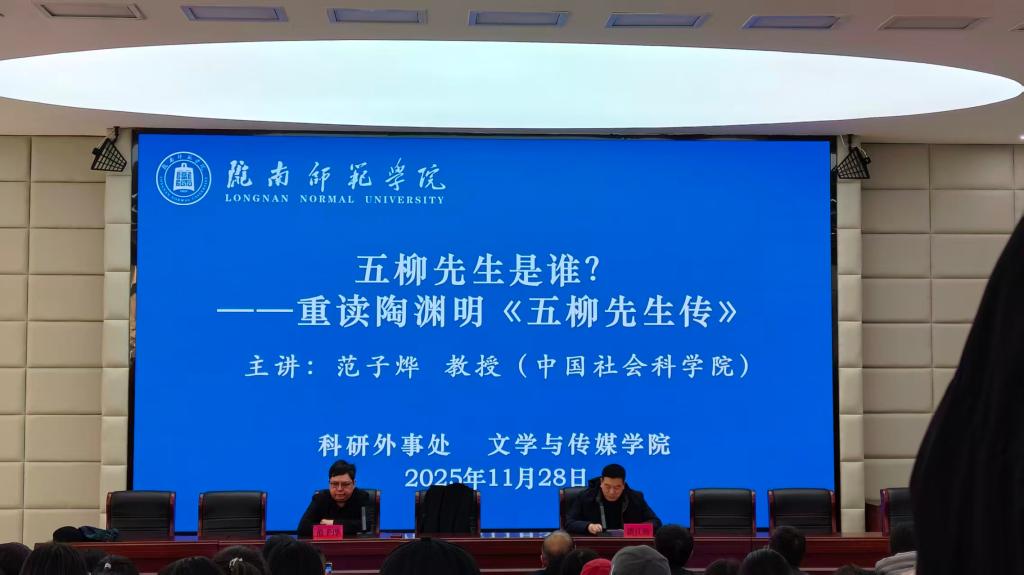11月28日下午,我校育心楼116报告厅,文学与传媒学院师生汇聚一堂,正在聆听来自中国社会科学院文学研究所的范子烨教授作《五柳先生是谁——重读陶渊明<五柳先生传>》的学术报告。报告由文学与传媒学院院长潘江艳主持。